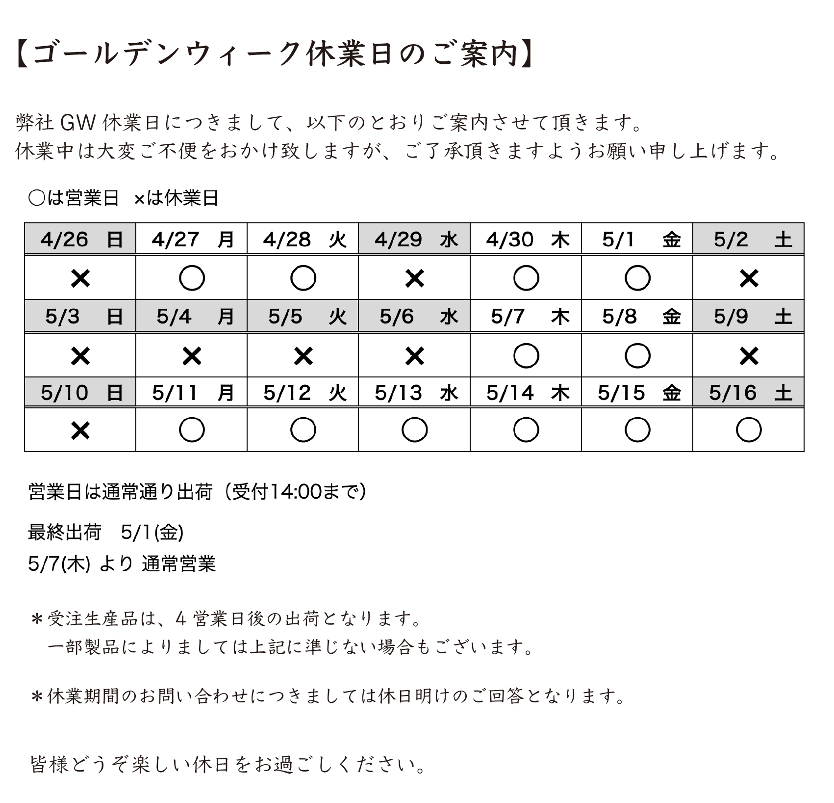 ゴールデンウィーク休業日のご案内